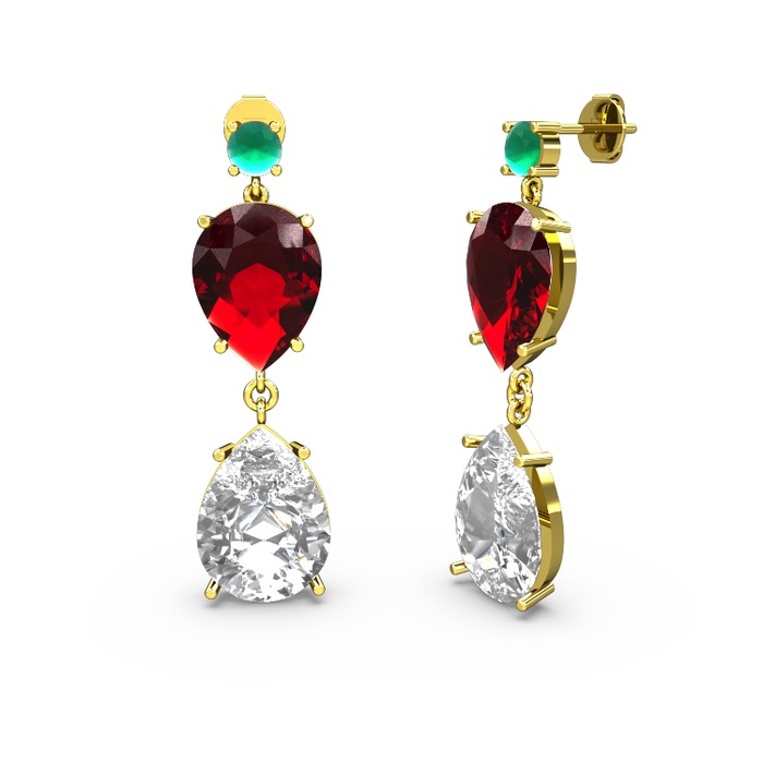 Kök zümrüt, swarovski ve garnet 8 ayar altın küpe