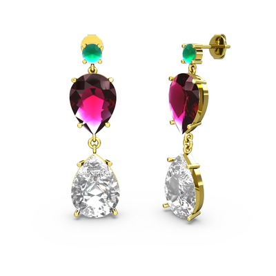 Kök zümrüt, swarovski ve rodolit garnet 18 ayar altın küpe