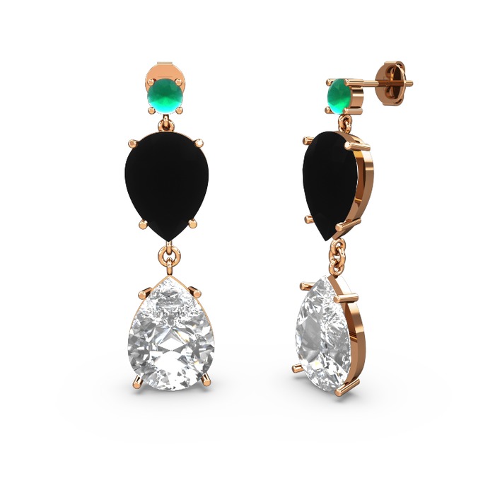 Kök zümrüt, swarovski ve siyah zirkon 8 ayar rose altın küpe