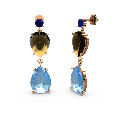 Lab safir, akuamarin ve dumanlı kuvars 14 ayar rose altın küpe