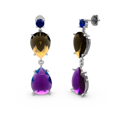 Lab safir, ametist ve dumanlı kuvars 18 ayar beyaz altın küpe
