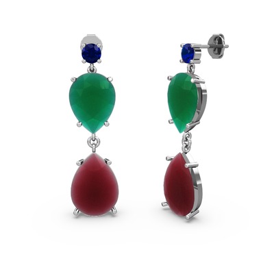 Lab safir, kök yakut ve kök zümrüt 18 ayar beyaz altın küpe