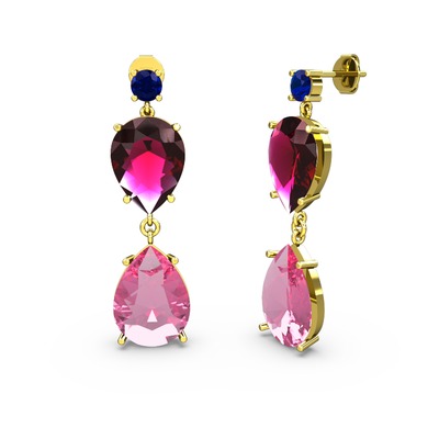 Lab safir, pembe kuvars ve rodolit garnet 18 ayar altın küpe