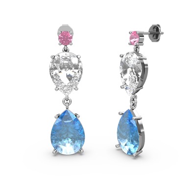Pembe kuvars, akuamarin ve beyaz zirkon 14 ayar beyaz altın küpe