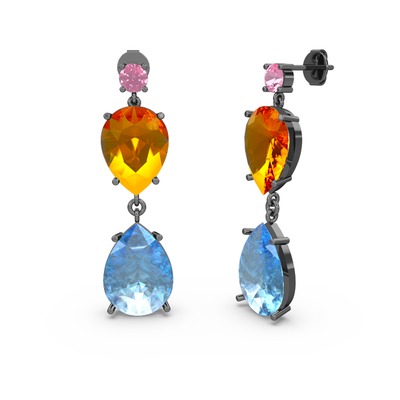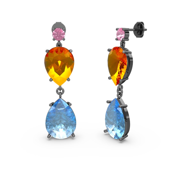 Pembe kuvars, akuamarin ve sitrin 925 ayar siyah rodyum kaplama gümüş küpe