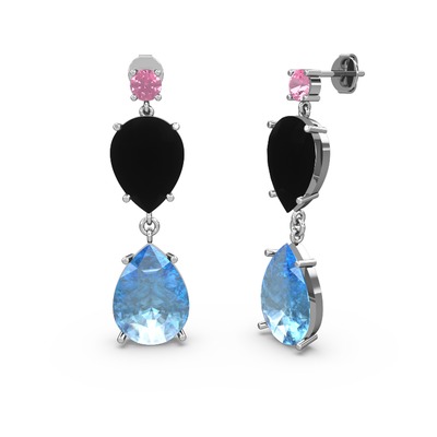 Pembe kuvars, akuamarin ve siyah zirkon 18 ayar beyaz altın küpe