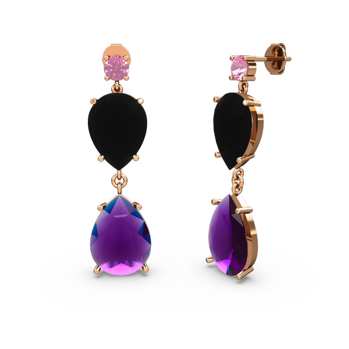 Pembe kuvars, ametist ve siyah zirkon 925 ayar rose altın kaplama gümüş küpe