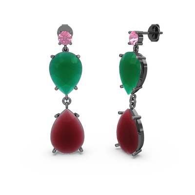 Pembe kuvars, kök yakut ve kök zümrüt 925 ayar siyah rodyum kaplama gümüş küpe