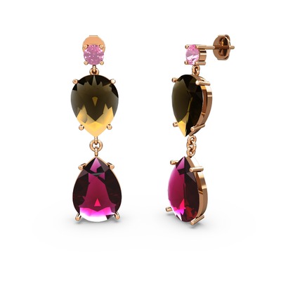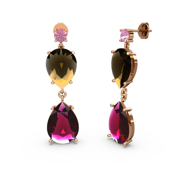 Pembe kuvars, rodolit garnet ve dumanlı kuvars 14 ayar rose altın küpe