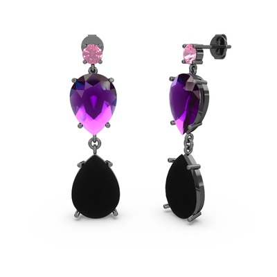 Pembe kuvars, siyah zirkon ve ametist 925 ayar siyah rodyum kaplama gümüş küpe
