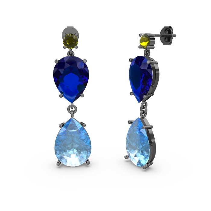 Peridot, akuamarin ve lab safir 925 ayar siyah rodyum kaplama gümüş küpe