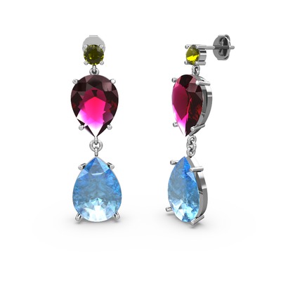 Peridot, akuamarin ve rodolit garnet 8 ayar beyaz altın küpe