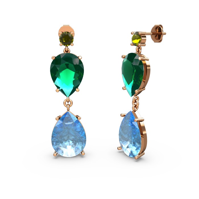 Peridot, akuamarin ve yeşil kuvars 8 ayar rose altın küpe