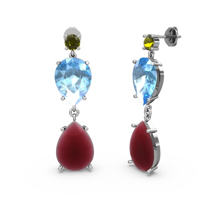 Peridot, kök yakut ve akuamarin 8 ayar beyaz altın küpe