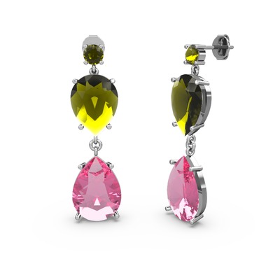 Peridot ve pembe kuvars 8 ayar beyaz altın küpe