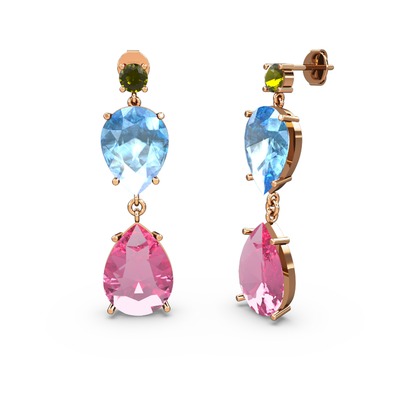 Peridot, pembe kuvars ve akuamarin 14 ayar rose altın küpe