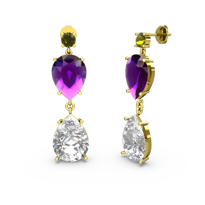 Peridot, swarovski ve ametist 925 ayar altın kaplama gümüş küpe