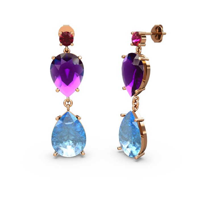 Rodolit garnet, akuamarin ve ametist 8 ayar rose altın küpe