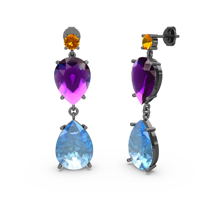 Sitrin, akuamarin ve ametist 925 ayar siyah rodyum kaplama gümüş küpe