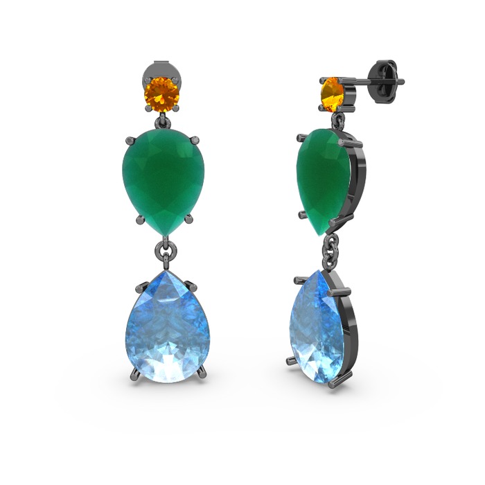 Sitrin, akuamarin ve kök zümrüt 925 ayar siyah rodyum kaplama gümüş küpe