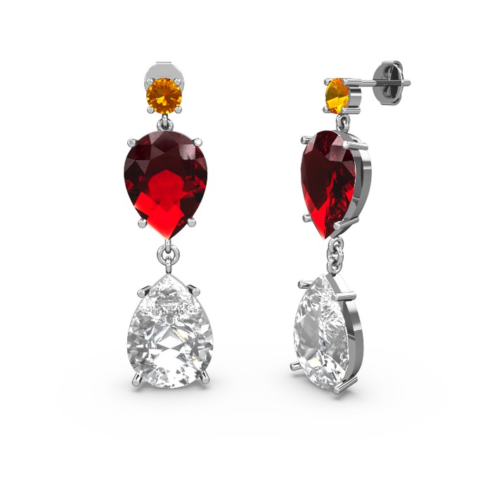 Sitrin, beyaz zirkon ve garnet 18 ayar beyaz altın küpe