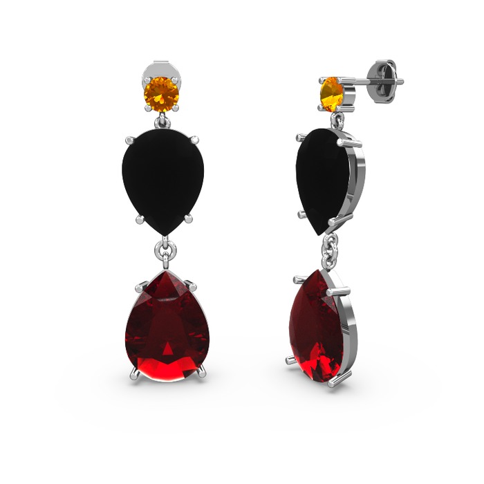 Sitrin, garnet ve siyah zirkon 14 ayar beyaz altın küpe