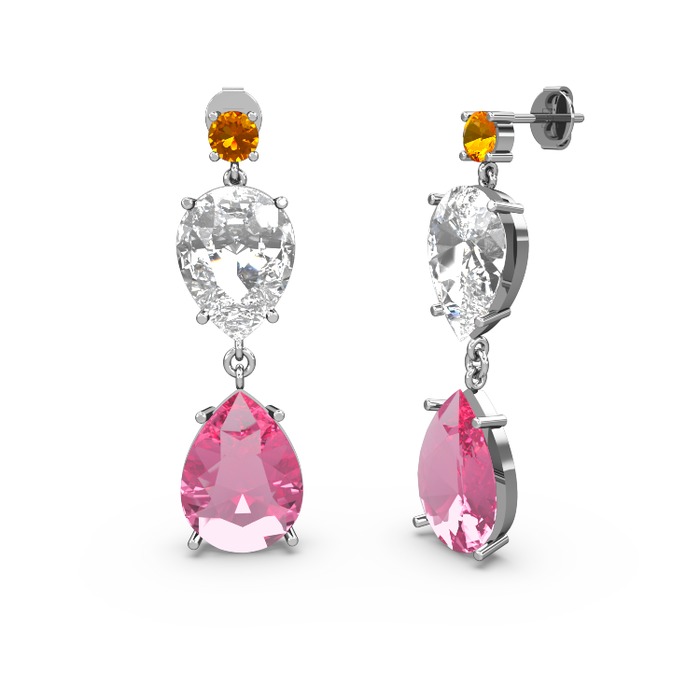 Sitrin, pembe kuvars ve beyaz zirkon 8 ayar beyaz altın küpe