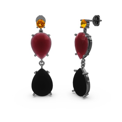 Sitrin, siyah zirkon ve kök yakut 925 ayar siyah rodyum kaplama gümüş küpe