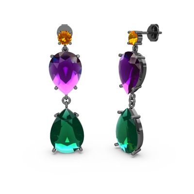 Sitrin, yeşil kuvars ve ametist 925 ayar siyah rodyum kaplama gümüş küpe