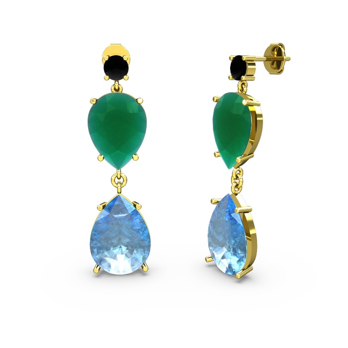 Siyah zirkon, akuamarin ve kök zümrüt 8 ayar altın küpe