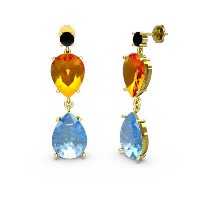 Siyah zirkon, akuamarin ve sitrin 18 ayar altın küpe