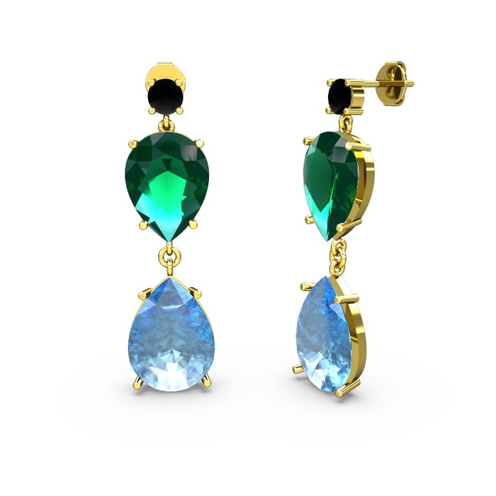 Siyah zirkon, akuamarin ve yeşil kuvars 14 ayar altın küpe