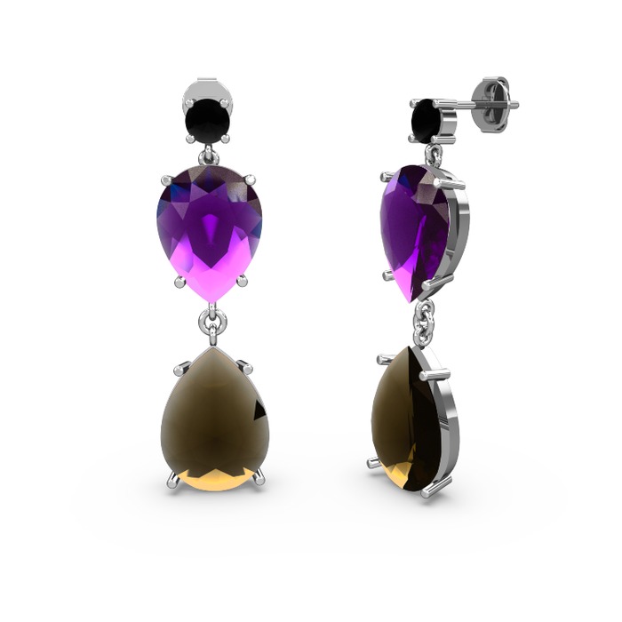 Siyah zirkon, dumanlı kuvars ve ametist 8 ayar beyaz altın küpe