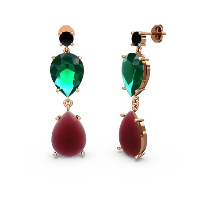 Siyah zirkon, kök yakut ve yeşil kuvars 8 ayar rose altın küpe