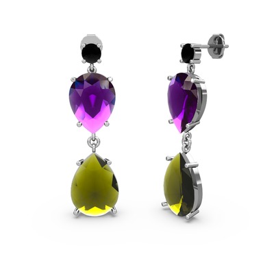Siyah zirkon, peridot ve ametist 14 ayar beyaz altın küpe