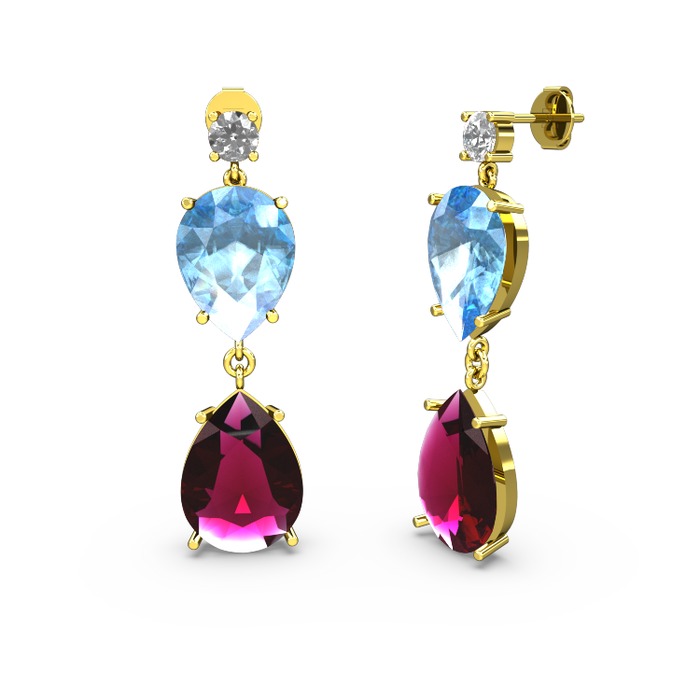 Swarovski, rodolit garnet ve akuamarin 14 ayar altın küpe