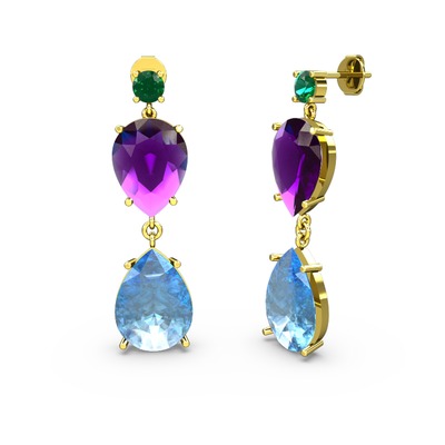 Yeşil kuvars, akuamarin ve ametist 8 ayar altın küpe