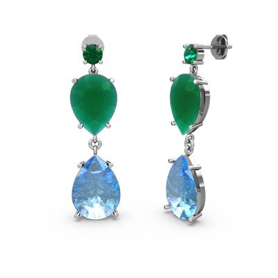 Yeşil kuvars, akuamarin ve kök zümrüt 14 ayar beyaz altın küpe