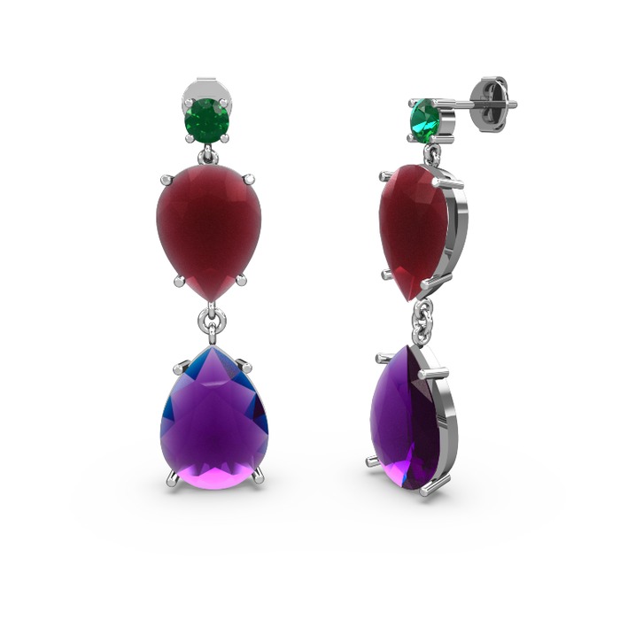 Yeşil kuvars, ametist ve kök yakut 14 ayar beyaz altın küpe
