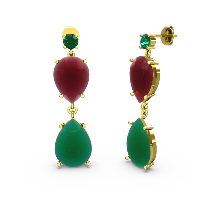 Yeşil kuvars, kök zümrüt ve kök yakut 14 ayar altın küpe