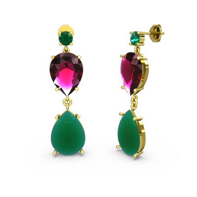 Yeşil kuvars, kök zümrüt ve rodolit garnet 18 ayar altın küpe