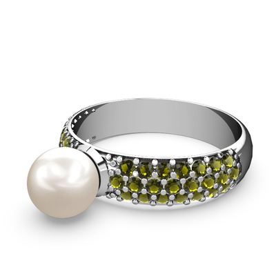 Inci ve peridot 14 ayar beyaz altın yüzük