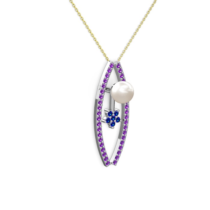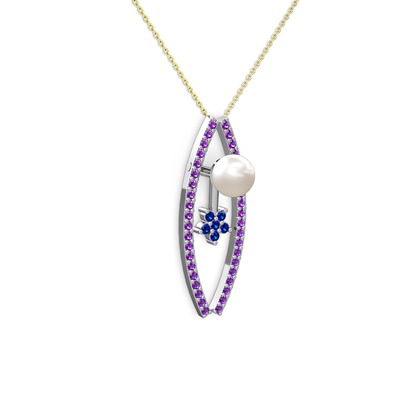 Inci, ametist ve lab safir 14 ayar beyaz altın kolye (40 cm gümüş rolo zincir)