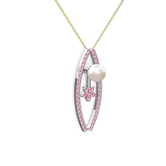 Inci ve pembe kuvars 14 ayar beyaz altın kolye (40 cm gümüş rolo zincir)