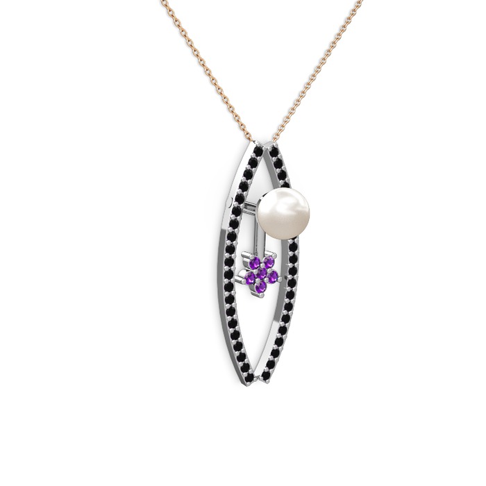 Inci, siyah zirkon ve ametist 18 ayar beyaz altın kolye (40 cm gümüş rolo zincir)