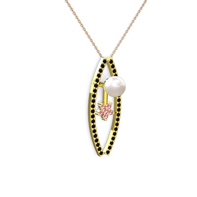 Inci, siyah zirkon ve pembe kuvars 8 ayar altın kolye (40 cm rose altın rolo zincir)