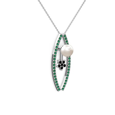 Inci, yeşil kuvars ve siyah zirkon 14 ayar beyaz altın kolye (40 cm gümüş rolo zincir)