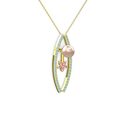 Pembe inci, akuamarin ve pembe kuvars 18 ayar altın kolye (40 cm altın rolo zincir)