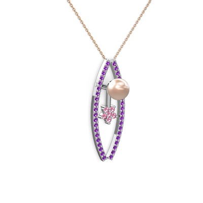 Pembe inci, ametist ve pembe kuvars 18 ayar beyaz altın kolye (40 cm rose altın rolo zincir)