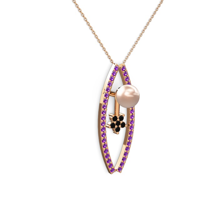 Pembe inci, ametist ve siyah zirkon 8 ayar rose altın kolye (40 cm rose altın rolo zincir)
